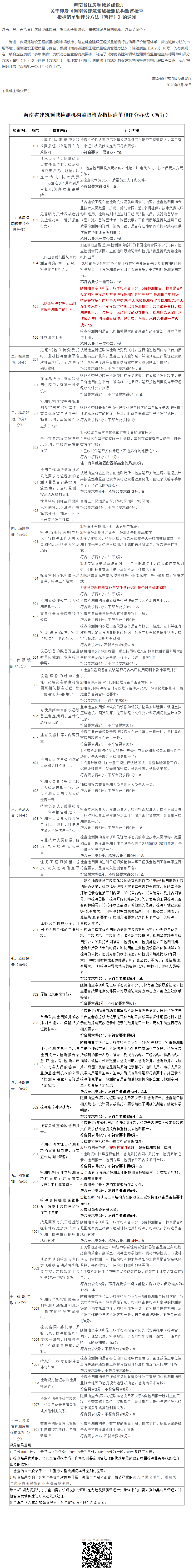 海南省住房和城鄉(xiāng)建設(shè)廳關(guān)于印發(fā)《海南省建筑領(lǐng)域檢測(cè)機(jī)構(gòu)監(jiān)督檢查指標(biāo)清單和評(píng)分方法(暫行)》的通知